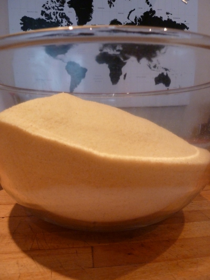 Precariously full bowl of sandy semolina