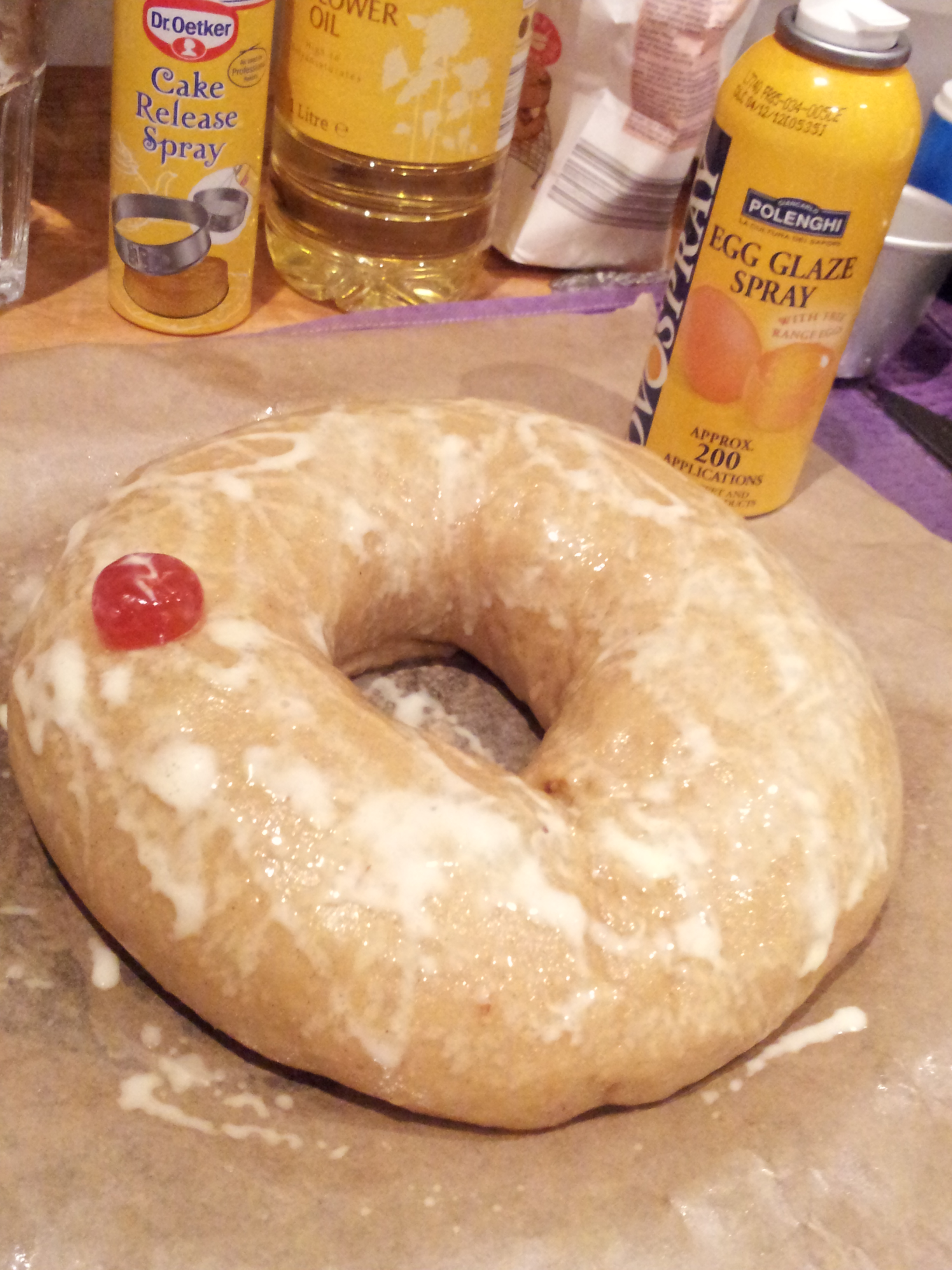 Using lazy egg wash in a can (!) and dotting with cherries