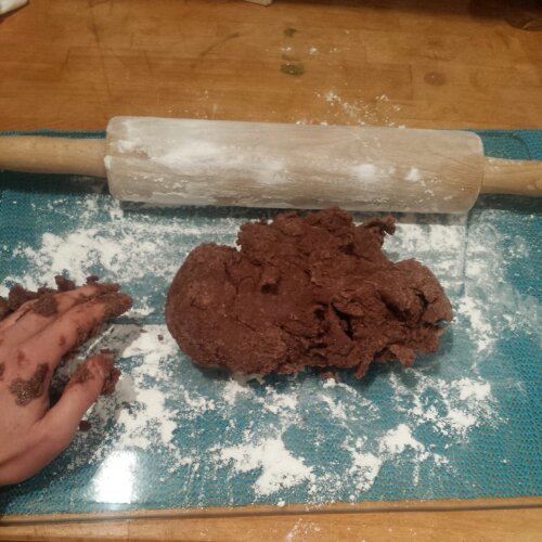 After about an hour of rising, (near the hot hob on the stove while I was cooking a chicken and vegetable dahl to encourage the dough to prove) the dough had doubled in size and was ready to be flavoured! I added the flavours a third at a time and kneaded them thoroughly through the dough.