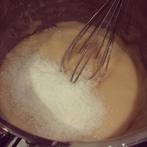2. Beat in coconut milk
